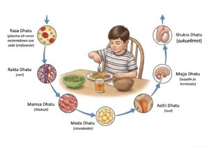 Ravitsemusprosessi alkaa syömästäsi ruoasta ja etenee kerros kerrokselta, dhatusta toiseen. Tätä prosessia ohjaa agni (ruoansulatuksen ja aineenvaihdunnan voima). Joka dhatulla ja solulla on oma aineenvaihduntansa. Prosessi on hidas: kun tänään syöt ruokaa, viimeisenä jonossa olevat kudokset saavat ruoastasi ravintoa yli kuukauden kuluttua.